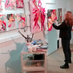 Angela Carlson, is a visual artist based in Shawnigan Lake, BC. She’s interested in both abstract and representational painting, with acrylic paint as her preferred medium. She has a BFA from Emily Carr University of Art and Design and is constantly learning from and inspired by the creativity and drive of other artists. Angela is also a scenic painter and project manager for theatre and film. She uses the large scale painting and planning skills and techniques she developed and learned as a scenic painter to create colourful murals. Prior to her work as a scenic artist in Metro Vancouver and on Vancouver Island, she was a potter and ceramic artist in Northern and Central BC.