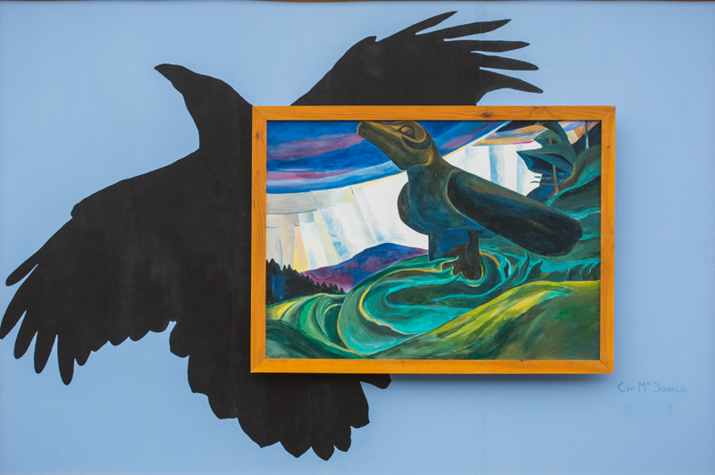 The raven is an important symbol in First Nations cultures of the Northwest Coast. The bird stole the sun, moon, and stars for humans, bringing light to the world. It also had supernatural powers and used them to obtain important things for humans, such as fresh water, salmon, and fire. Known as the Keeper of Secrets, Raven possessed knowledge of hunting and the world, and shared these secrets with First Nations peoples. The mural contains a reproduction of Emily Carr’s Big Raven.