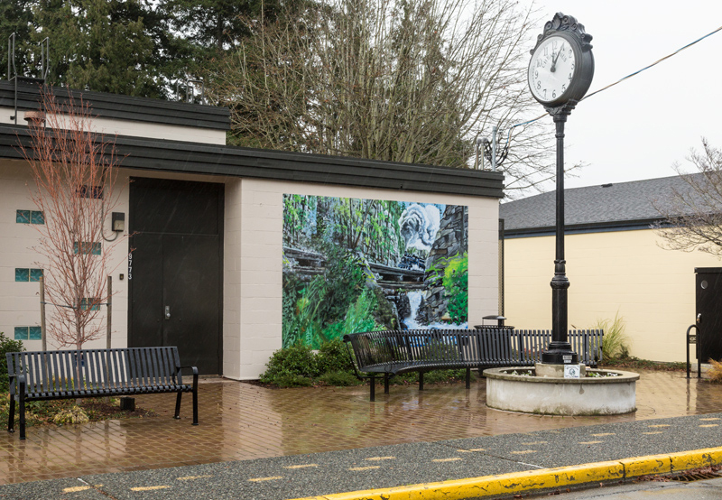 To work around this, a digital image was created from the artist’s original concept drawing that now hangs in the Chemainus Valley Museum. The finished file was printed on a special plastic film and mounted on three aluminum panels. Leon’s Signs created the film and installed it on November 24. To fit its new site, the finished mural is smaller than the original, which spanned the full 16.3 metre by 6.6 metre (53×22 feet) length of the visitors centre.